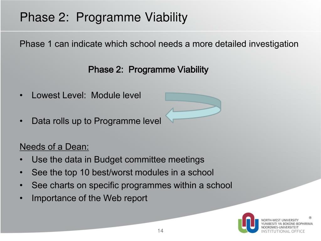 Phase 2: Programme Viability Phase 1 can indicate which school needs a more detailed investigation Phase 2: Programme Viability • Lowest Level: Module level • Data rolls up to Programme level Needs of a Dean: • Use the data in Budget committee meetings • See the top 10 best/worst modules in a school • See charts on specific programmes within a school • Importance of the Web report