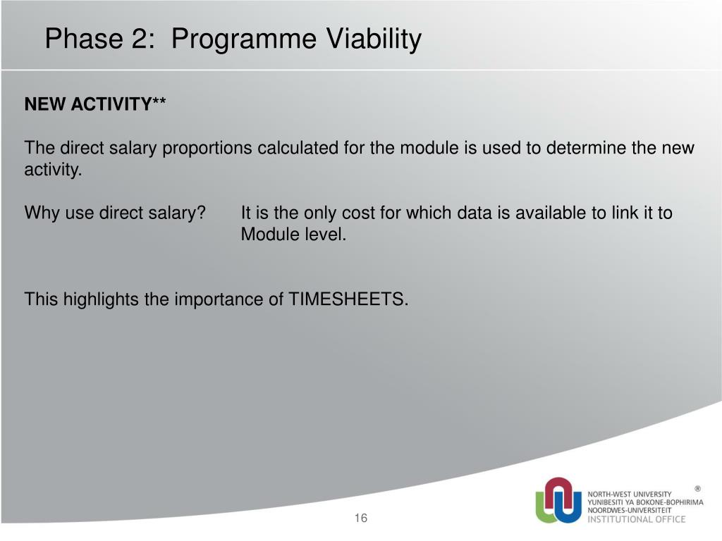 Phase 2: Programme Viability NEW ACTIVITY** The direct salary proportions calculated for the module is used to determine the new activity. Why use direct salary? It is the only cost for which data is available to link it to Module level. This highlights the importance of TIMESHEETS.