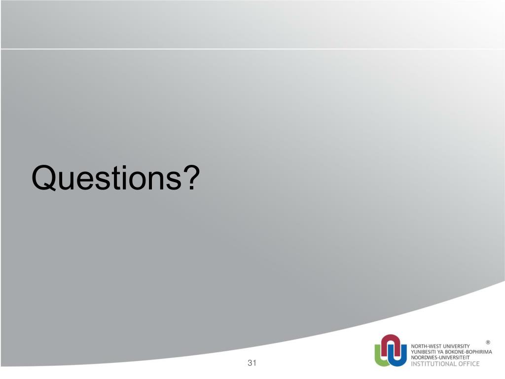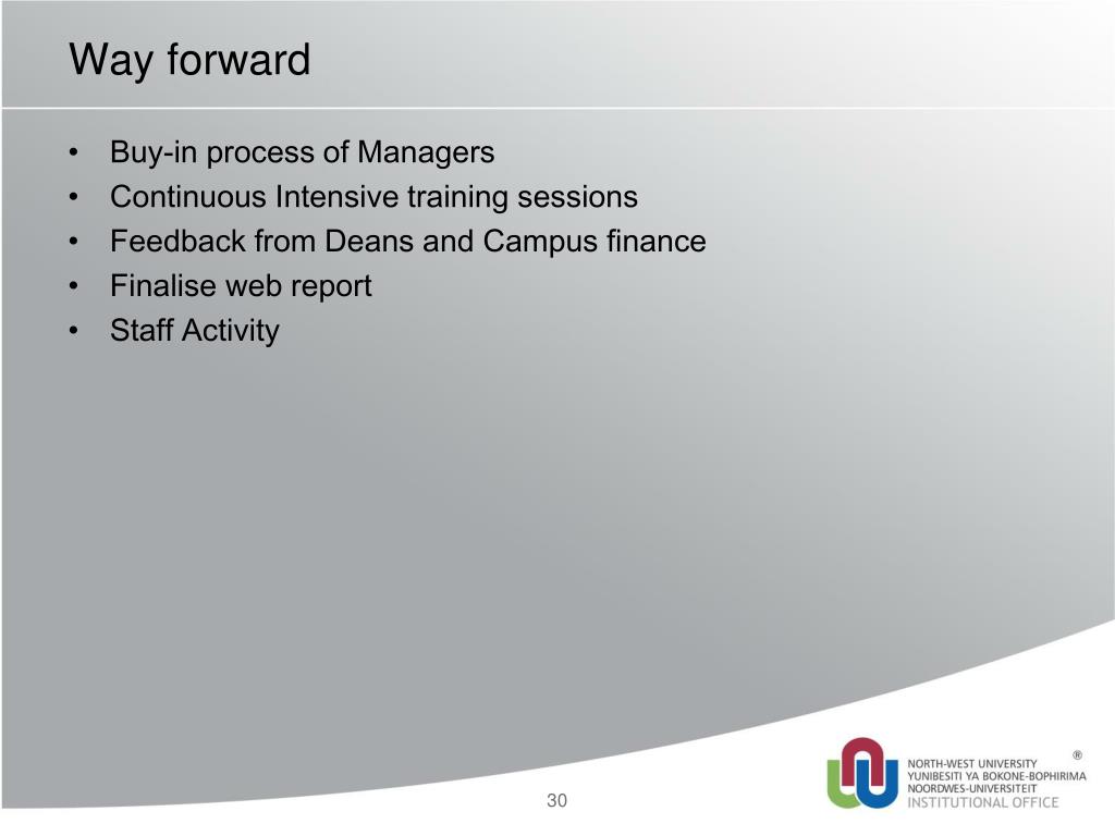 Way forward • Buy-in process of Managers • Continuous Intensive training sessions • Feedback from Deans and Campus finance • Finalise web report • Staff Activity