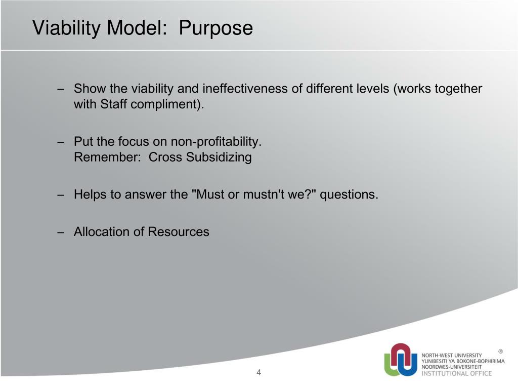Viability Model: Purpose • Show the viability and ineffectiveness of different levels (works together with Staff compliment). • Put the focus on non-profitability. Remember: Cross Subsidizing • Helps to answer the "Must or mustn't we?" questions. • Allocation of Resources