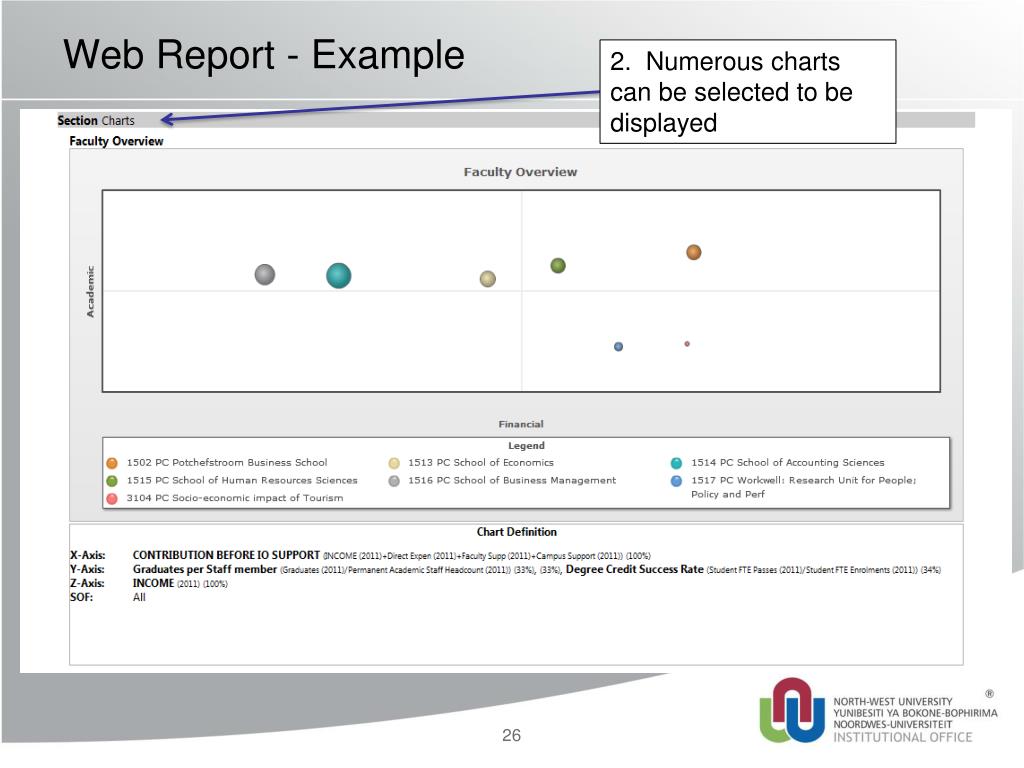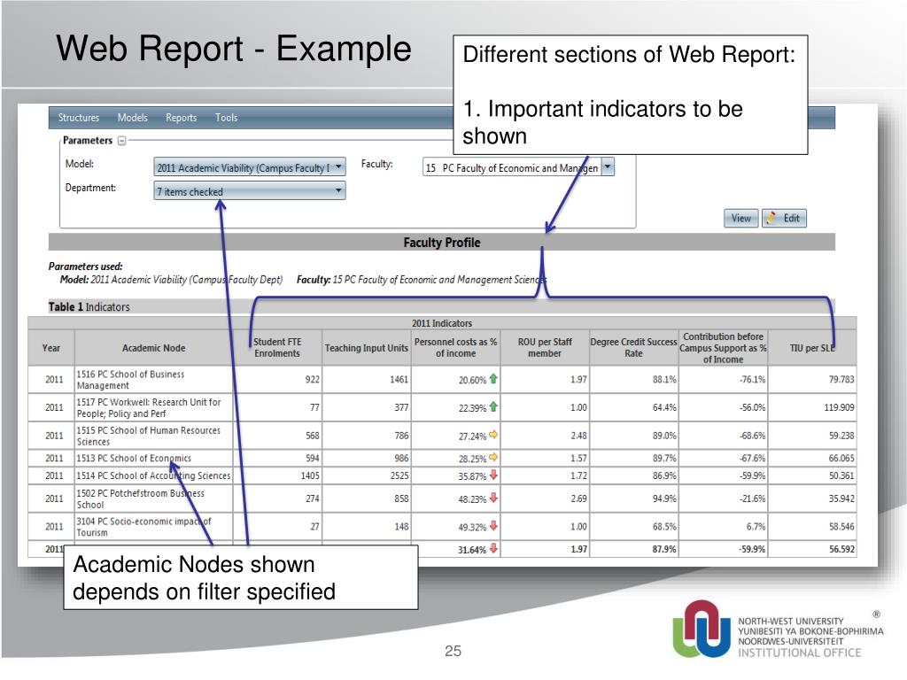Web Report - Example Different sections of Web Report: 1. Important indicators to be shown Academic Nodes shown depends on filter specified