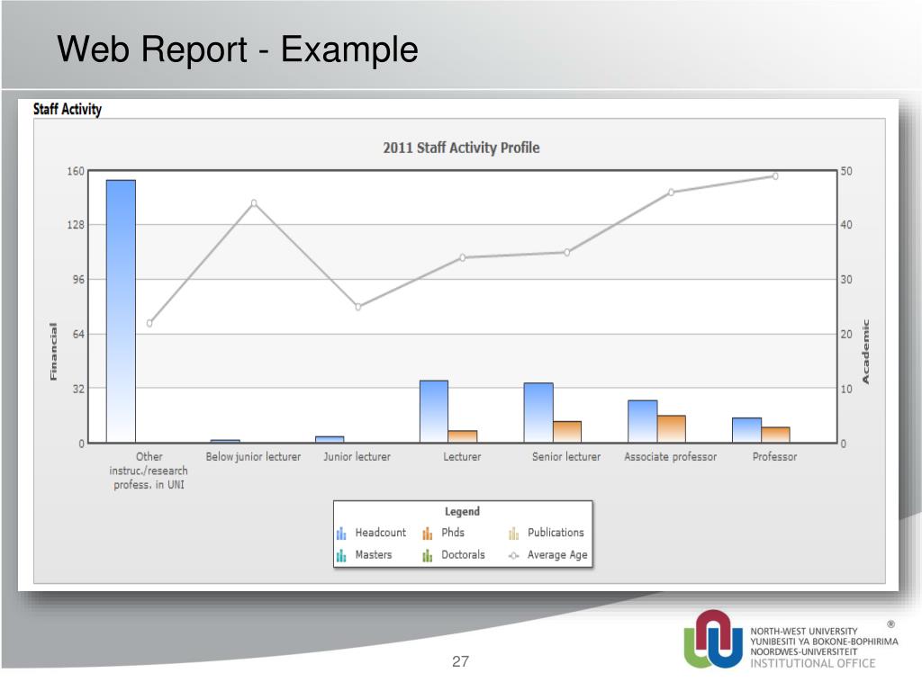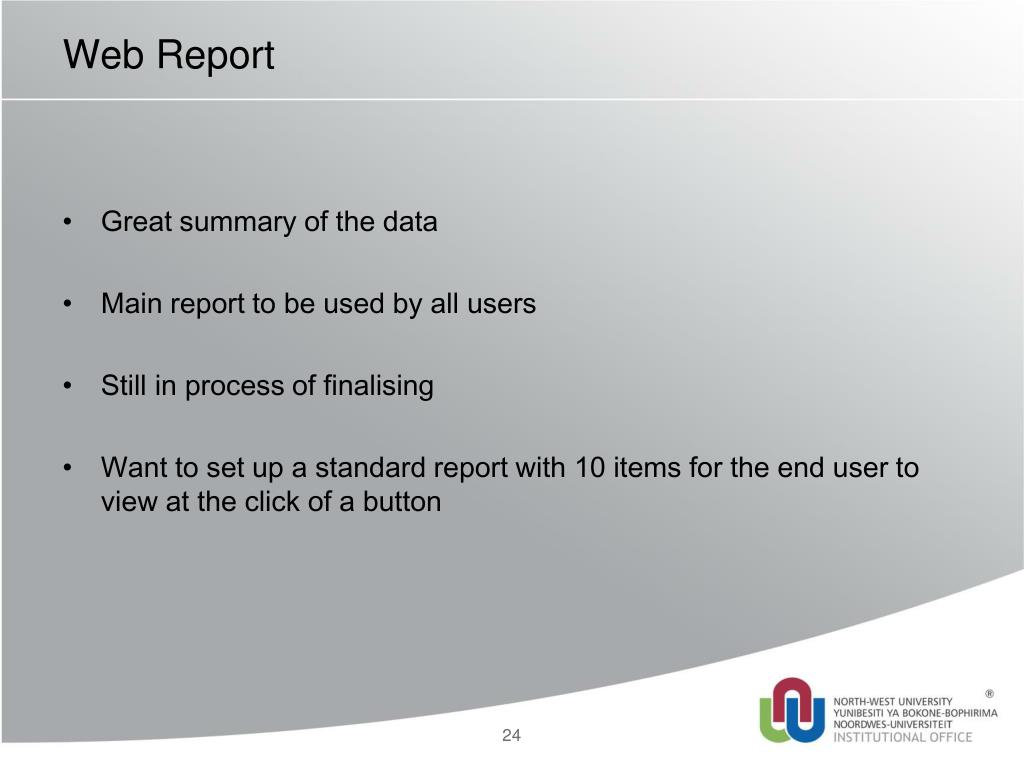 Web Report • Great summary of the data • Main report to be used by all users • Still in process of finalising • Want to set up a standard report with 10 items for the end user to view at the click of a button