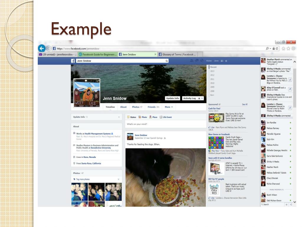 Common Facebook Terms • Wall: space on your profile where you can your friends can post and share information. • Timeline: Your collection of the photos, stories and experiences that share your story. • Tagging: A tag links a person, page or place to something you post. • Profile Picture: Main photo of you on your timeline. • Page: Allows businesses, organizations and brands to connect with people on Facebook. Individuals have profiles, businesses and organizations have pages. • Notifications: Email, onsite or mobile updates about activity on Facebook. • Newsfeed: A newsfeed is an ongoing list of updates on your homepage that shows you what’s new with the friends and pages you follow. • Networks: Affiliations with schools, workplaces or shared interests on Facebook. • Like: Clicking Like is a way to give positive feedback and connect with things you care about. For example, liking the page for an organization will send updates about that organization to your newsfeed. • Groups: close circles of people that share and keep in touch on Facebook. This can be a group of friends or group of people who share similar interests. • Friend: Friends are people you connect and share with on Facebook. • Follow: A way to hear from people or organizations you’re interested in, even if you’re not friends. • Cover Photo: The large picture at the top of your timeline, right above your profile picture. • Block: You can block someone to unfriend them and prevent them from starting conversations with you or seeing things you post on your timeline. • Activity Log: A tool that lets you review and manage everything you share on Facebook. Only you can see your activity log.