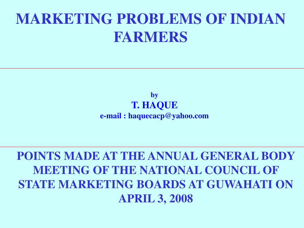 MARKETING PROBLEMS OF INDIAN FARMERS by T. HAQUEe-mail : haquecacp@yahoo.com POINTS MADE AT THE ANNUAL GENERAL BODY MEETING OF THE NATIONAL COUNCIL OF STATE MARKETING BOARDS AT GUWAHATI ON APRIL 3, 2008
