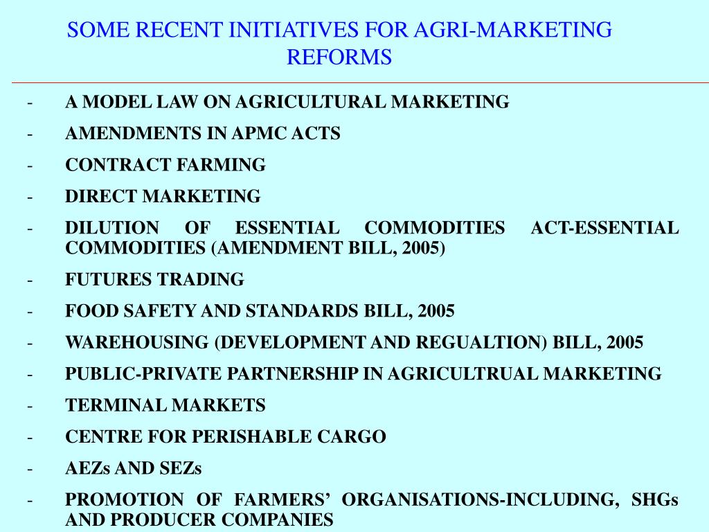 SOME RECENT INITIATIVES FOR AGRI-MARKETING REFORMS • A MODEL LAW ON AGRICULTURAL MARKETING • AMENDMENTS IN APMC ACTS • CONTRACT FARMING • DIRECT MARKETING • DILUTION OF ESSENTIAL COMMODITIES ACT-ESSENTIAL COMMODITIES (AMENDMENT BILL, 2005) • FUTURES TRADING • FOOD SAFETY AND STANDARDS BILL, 2005 • WAREHOUSING (DEVELOPMENT AND REGUALTION) BILL, 2005 • PUBLIC-PRIVATE PARTNERSHIP IN AGRICULTRUAL MARKETING • TERMINAL MARKETS • CENTRE FOR PERISHABLE CARGO • AEZs AND SEZs • PROMOTION OF FARMERS’ ORGANISATIONS-INCLUDING, SHGs AND PRODUCER COMPANIES