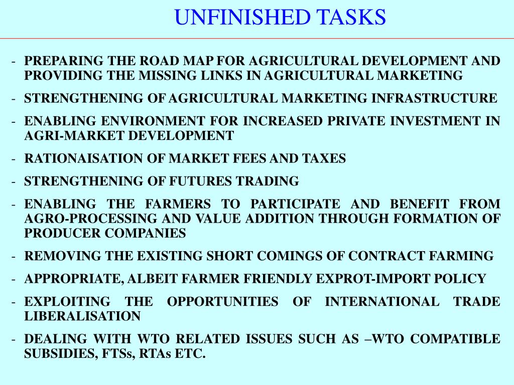 UNFINISHED TASKS • PREPARING THE ROAD MAP FOR AGRICULTURAL DEVELOPMENT AND PROVIDING THE MISSING LINKS IN AGRICULTURAL MARKETING • STRENGTHENING OF AGRICULTURAL MARKETING INFRASTRUCTURE • ENABLING ENVIRONMENT FOR INCREASED PRIVATE INVESTMENT IN AGRI-MARKET DEVELOPMENT • RATIONAISATION OF MARKET FEES AND TAXES • STRENGTHENING OF FUTURES TRADING • ENABLING THE FARMERS TO PARTICIPATE AND BENEFIT FROM AGRO-PROCESSING AND VALUE ADDITION THROUGH FORMATION OF PRODUCER COMPANIES • REMOVING THE EXISTING SHORT COMINGS OF CONTRACT FARMING • APPROPRIATE, ALBEIT FARMER FRIENDLY EXPROT-IMPORT POLICY • EXPLOITING THE OPPORTUNITIES OF INTERNATIONAL TRADE LIBERALISATION • DEALING WITH WTO RELATED ISSUES SUCH AS –WTO COMPATIBLE SUBSIDIES, FTSs, RTAs ETC.