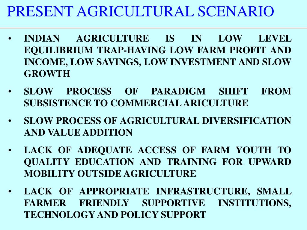 PRESENT AGRICULTURAL SCENARIO • INDIAN AGRICULTURE IS IN LOW LEVEL EQUILIBRIUM TRAP-HAVING LOW FARM PROFIT AND INCOME, LOW SAVINGS, LOW INVESTMENT AND SLOW GROWTH • SLOW PROCESS OF PARADIGM SHIFT FROM SUBSISTENCE TO COMMERCIAL ARICULTURE • SLOW PROCESS OF AGRICULTURAL DIVERSIFICATION AND VALUE ADDITION • LACK OF ADEQUATE ACCESS OF FARM YOUTH TO QUALITY EDUCATION AND TRAINING FOR UPWARD MOBILITY OUTSIDE AGRICULTURE • LACK OF APPROPRIATE INFRASTRUCTURE, SMALL FARMER FRIENDLY SUPPORTIVE INSTITUTIONS, TECHNOLOGY AND POLICY SUPPORT