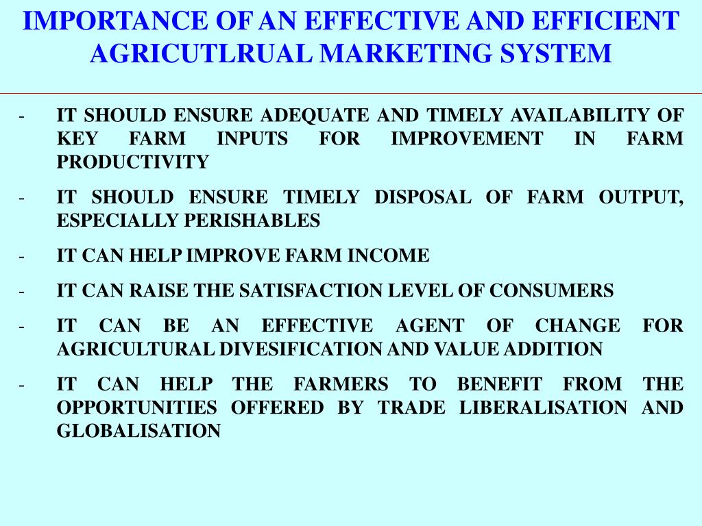 IMPORTANCE OF AN EFFECTIVE AND EFFICIENT AGRICUTLRUAL MARKETING SYSTEM • IT SHOULD ENSURE ADEQUATE AND TIMELY AVAILABILITY OF KEY FARM INPUTS FOR IMPROVEMENT IN FARM PRODUCTIVITY • IT SHOULD ENSURE TIMELY DISPOSAL OF FARM OUTPUT, ESPECIALLY PERISHABLES • IT CAN HELP IMPROVE FARM INCOME • IT CAN RAISE THE SATISFACTION LEVEL OF CONSUMERS • IT CAN BE AN EFFECTIVE AGENT OF CHANGE FOR AGRICULTURAL DIVESIFICATION AND VALUE ADDITION • IT CAN HELP THE FARMERS TO BENEFIT FROM THE OPPORTUNITIES OFFERED BY TRADE LIBERALISATION AND GLOBALISATION