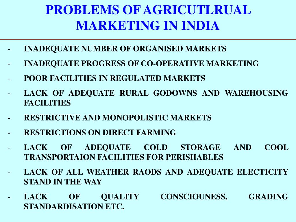PROBLEMS OF AGRICUTLRUAL MARKETING IN INDIA • INADEQUATE NUMBER OF ORGANISED MARKETS • INADEQUATE PROGRESS OF CO-OPERATIVE MARKETING • POOR FACILITIES IN REGULATED MARKETS • LACK OF ADEQUATE RURAL GODOWNS AND WAREHOUSING FACILITIES • RESTRICTIVE AND MONOPOLISTIC MARKETS • RESTRICTIONS ON DIRECT FARMING • LACK OF ADEQUATE COLD STORAGE AND COOL TRANSPORTAION FACILITIES FOR PERISHABLES • LACK OF ALL WEATHER RAODS AND ADEQUATE ELECTICITY STAND IN THE WAY • LACK OF QUALITY CONSCIOUNESS, GRADING STANDARDISATION ETC.