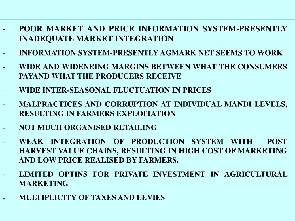POOR MARKET AND PRICE INFORMATION SYSTEM-PRESENTLY INADEQUATE MARKET INTEGRATION • INFORMATION SYSTEM-PRESENTLY AGMARK NET SEEMS TO WORK • WIDE AND WIDENEING MARGINS BETWEEN WHAT THE CONSUMERS PAYAND WHAT THE PRODUCERS RECEIVE • WIDE INTER-SEASONAL FLUCTUATION IN PRICES • MALPRACTICES AND CORRUPTION AT INDIVIDUAL MANDI LEVELS, RESULTING IN FARMERS EXPLOITATION • NOT MUCH ORGANISED RETAILING • WEAK INTEGRATION OF PRODUCTION SYSTEM WITH POST HARVEST VALUE CHAINS, RESULTING IN HIGH COST OF MARKETING AND LOW PRICE REALISED BY FARMERS. • LIMITED OPTINS FOR PRIVATE INVESTMENT IN AGRICULTURAL MARKETING • MULTIPLICITY OF TAXES AND LEVIES