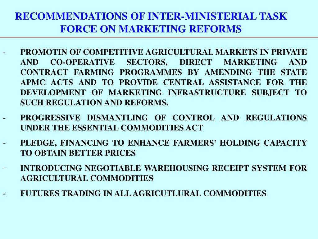 RECOMMENDATIONS OF INTER-MINISTERIAL TASK FORCE ON MARKETING REFORMS • PROMOTIN OF COMPETITIVE AGRICULTURAL MARKETS IN PRIVATE AND CO-OPERATIVE SECTORS, DIRECT MARKETING AND CONTRACT FARMING PROGRAMMES BY AMENDING THE STATE APMC ACTS AND TO PROVIDE CENTRAL ASSISTANCE FOR THE DEVELOPMENT OF MARKETING INFRASTRUCTURE SUBJECT TO SUCH REGULATION AND REFORMS. • PROGRESSIVE DISMANTLING OF CONTROL AND REGULATIONS UNDER THE ESSENTIAL COMMODITIES ACT • PLEDGE, FINANCING TO ENHANCE FARMERS’ HOLDING CAPACITY TO OBTAIN BETTER PRICES • INTRODUCING NEGOTIABLE WAREHOUSING RECEIPT SYSTEM FOR AGRICULTURAL COMMODITIES • FUTURES TRADING IN ALL AGRICUTLURAL COMMODITIES