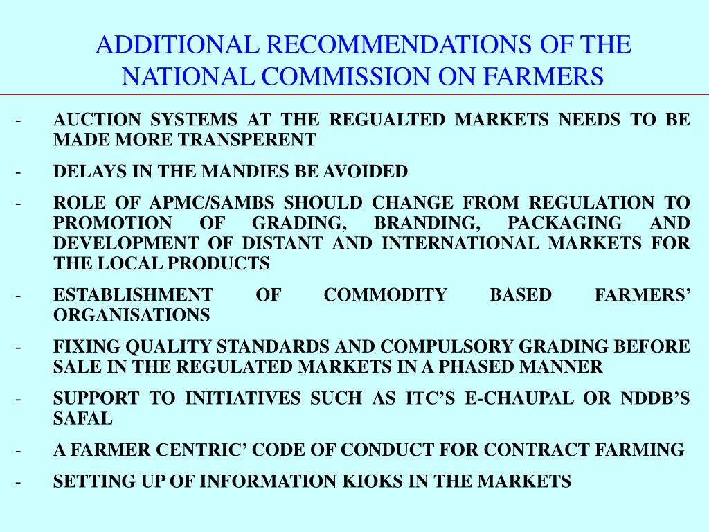 ADDITIONAL RECOMMENDATIONS OF THE NATIONAL COMMISSION ON FARMERS • AUCTION SYSTEMS AT THE REGUALTED MARKETS NEEDS TO BE MADE MORE TRANSPERENT • DELAYS IN THE MANDIES BE AVOIDED • ROLE OF APMC/SAMBS SHOULD CHANGE FROM REGULATION TO PROMOTION OF GRADING, BRANDING, PACKAGING AND DEVELOPMENT OF DISTANT AND INTERNATIONAL MARKETS FOR THE LOCAL PRODUCTS • ESTABLISHMENT OF COMMODITY BASED FARMERS’ ORGANISATIONS • FIXING QUALITY STANDARDS AND COMPULSORY GRADING BEFORE SALE IN THE REGULATED MARKETS IN A PHASED MANNER • SUPPORT TO INITIATIVES SUCH AS ITC’S E-CHAUPAL OR NDDB’S SAFAL • A FARMER CENTRIC’ CODE OF CONDUCT FOR CONTRACT FARMING • SETTING UP OF INFORMATION KIOKS IN THE MARKETS