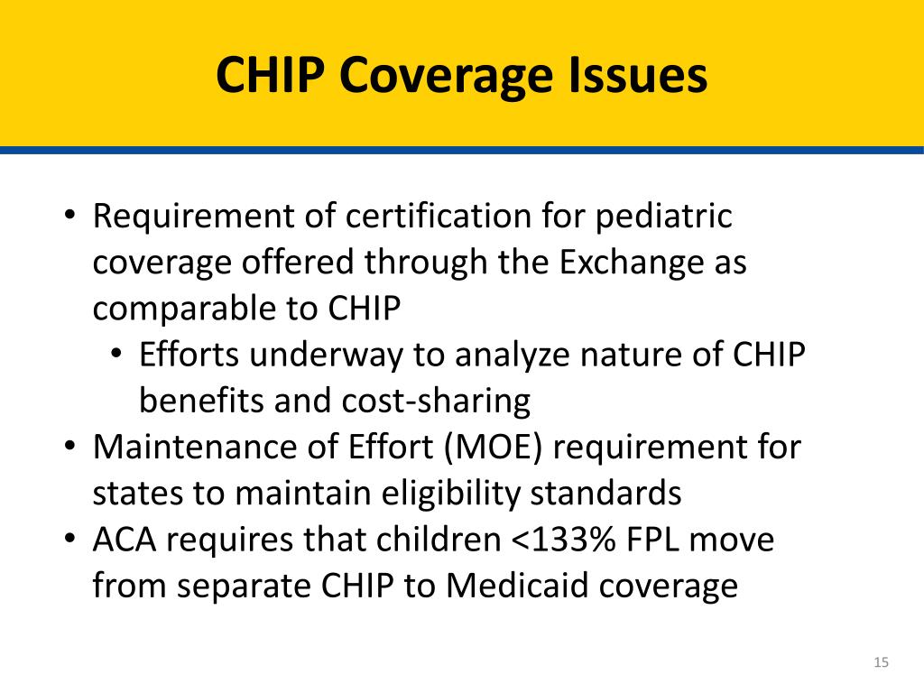 CHIP Coverage Issues • Requirement of certification for pediatric coverage offered through the Exchange as comparable to CHIP • Efforts underway to analyze nature of CHIP benefits and cost-sharing • Maintenance of Effort (MOE) requirement for states to maintain eligibility standards • ACA requires that children <133% FPL move from separate CHIP to Medicaid coverage