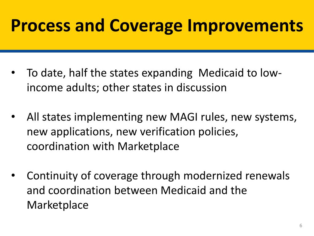 Process and Coverage Improvements • To date, half the states expanding Medicaid to low-income adults; other states in discussion • All states implementing new MAGI rules, new systems, new applications, new verification policies, coordination with Marketplace • Continuity of coverage through modernized renewals and coordination between Medicaid and the Marketplace