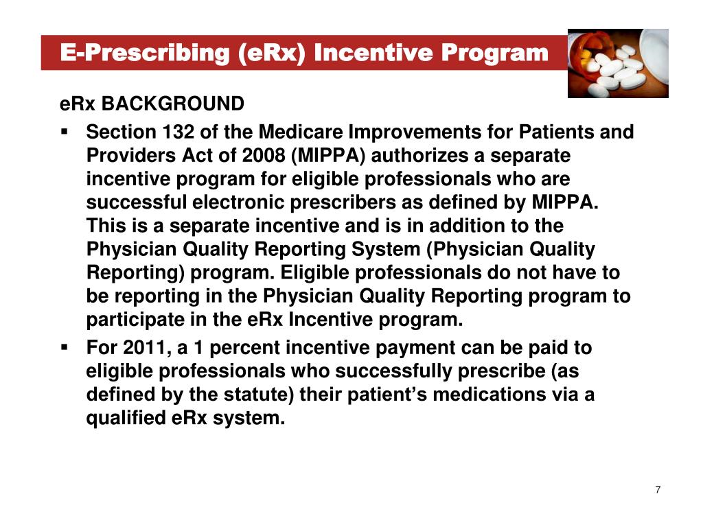 E-Prescribing (eRx) Incentive Program eRx BACKGROUND • Section 132 of the Medicare Improvements for Patients and Providers Act of 2008 (MIPPA) authorizes a separate incentive program for eligible professionals who are successful electronic prescribers as defined by MIPPA. This is a separate incentive and is in addition to the Physician Quality Reporting System (Physician Quality Reporting) program. Eligible professionals do not have to be reporting in the Physician Quality Reporting program to participate in the eRx Incentive program. • For 2011, a 1 percent incentive payment can be paid to eligible professionals who successfully prescribe (as defined by the statute) their patient’s medications via a qualified eRx system.