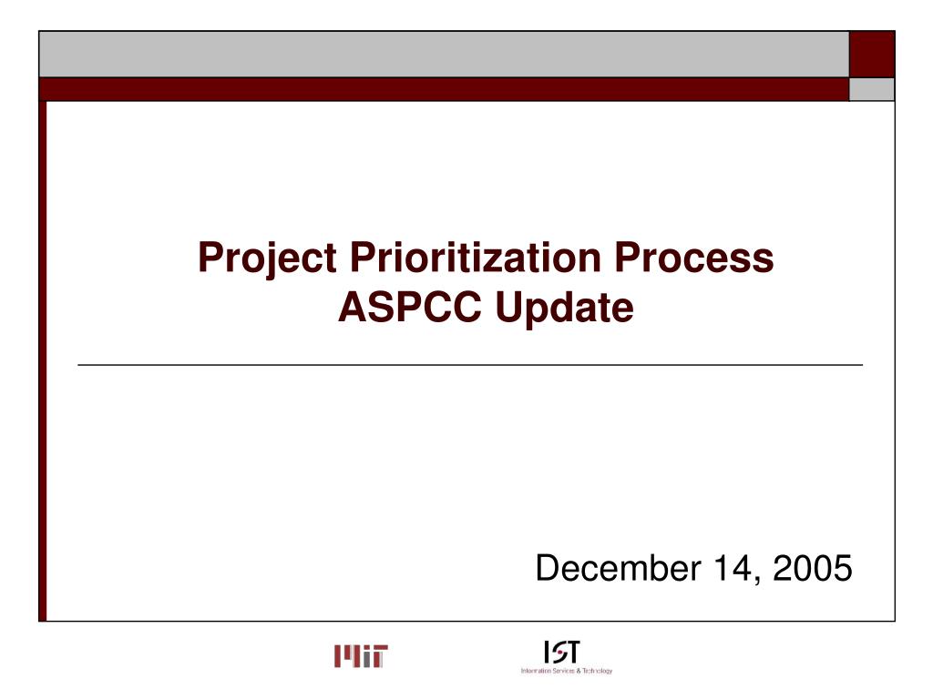 Process Review • December – Align resources to projects and present proposed timeline to ASPCC • Factors to consider include • Admin Comp resources and skills required for each project • Business resource availability (leveling) and timing (peak period considerations) • Balance number of large projects & projects in the same or similar functional areas