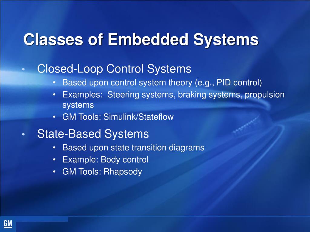 Classes of Embedded Systems • Closed-Loop Control Systems • Based upon control system theory (e.g., PID control) • Examples: Steering systems, braking systems, propulsion systems • GM Tools: Simulink/Stateflow • State-Based Systems • Based upon state transition diagrams • Example: Body control • GM Tools: Rhapsody