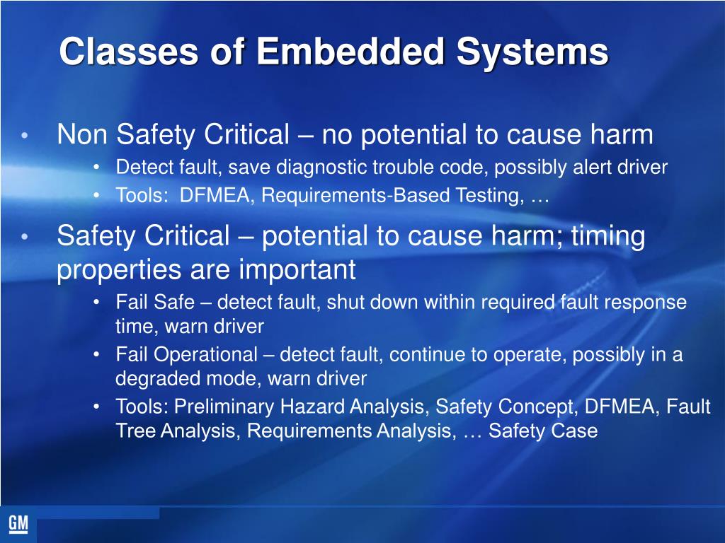 Classes of Embedded Systems • Non Safety Critical – no potential to cause harm • Detect fault, save diagnostic trouble code, possibly alert driver • Tools: DFMEA, Requirements-Based Testing, … • Safety Critical – potential to cause harm; timing properties are important • Fail Safe – detect fault, shut down within required fault response time, warn driver • Fail Operational – detect fault, continue to operate, possibly in a degraded mode, warn driver • Tools: Preliminary Hazard Analysis, Safety Concept, DFMEA, Fault Tree Analysis, Requirements Analysis, … Safety Case