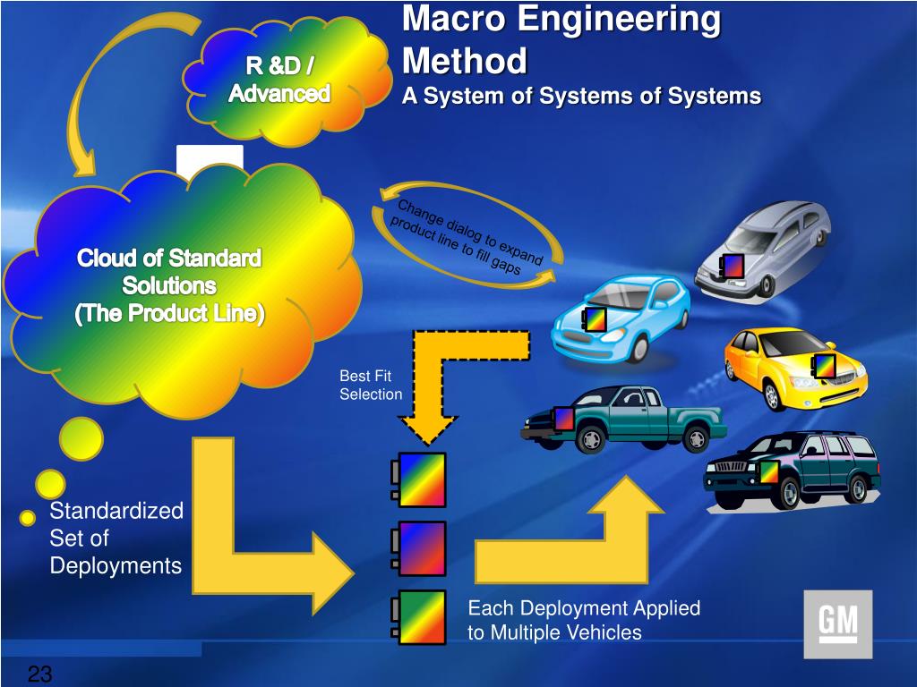 Macro Engineering MethodA System of Systems of Systems Cloud of Standard Solutions (The Product Line) Change dialog to expand product line to fill gaps R &D / Advanced Best Fit Selection Standardized Set of Deployments Each Deployment Applied to Multiple Vehicles