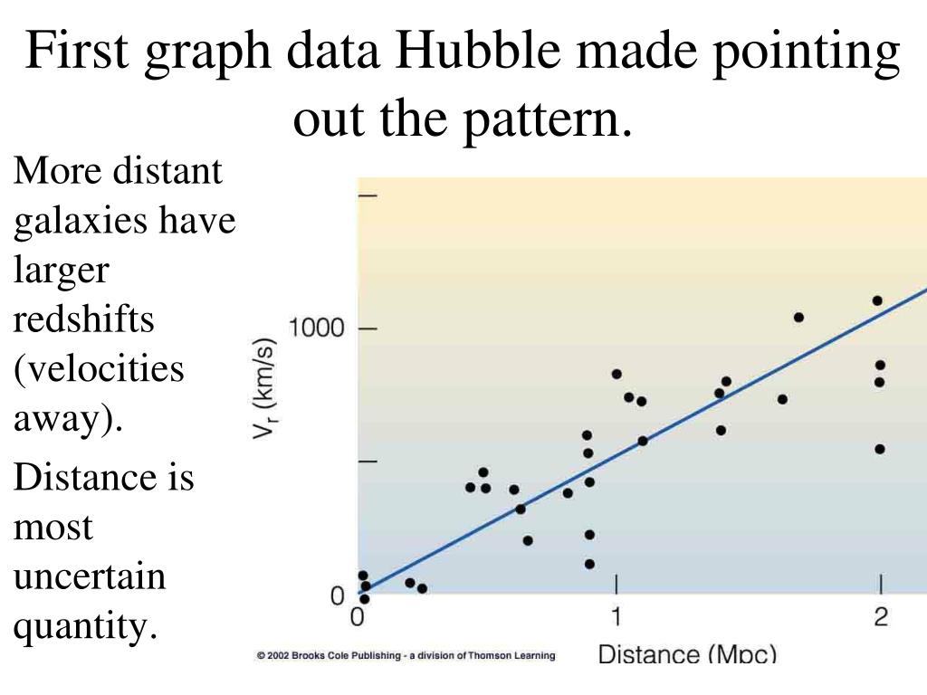 First graph data Hubble made pointing out the pattern. • More distant galaxies have larger redshifts (velocities away). • Distance is most uncertain quantity.