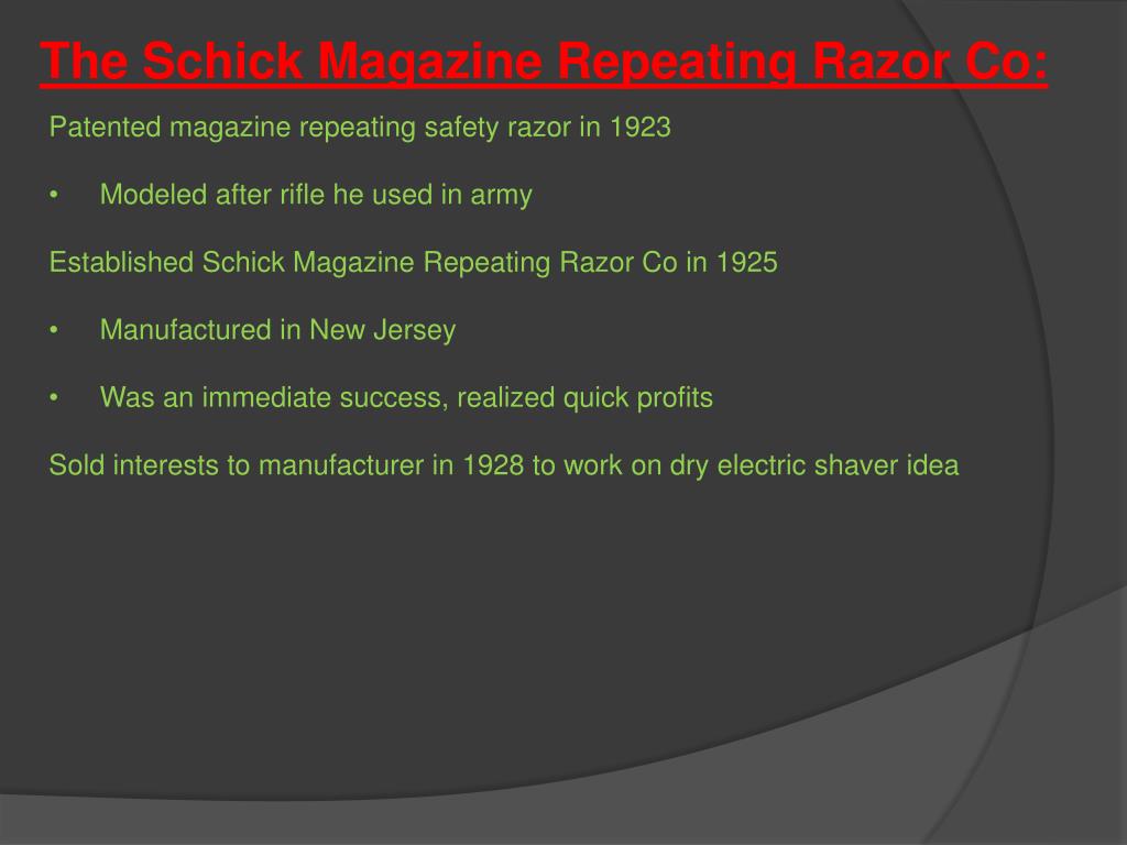 The Schick Magazine Repeating Razor Co: • Patented magazine repeating safety razor in 1923 • Modeled after rifle he used in army • Established Schick Magazine Repeating Razor Co in 1925 • Manufactured in New Jersey • Was an immediate success, realized quick profits • Sold interests to manufacturer in 1928 to work on dry electric shaver idea