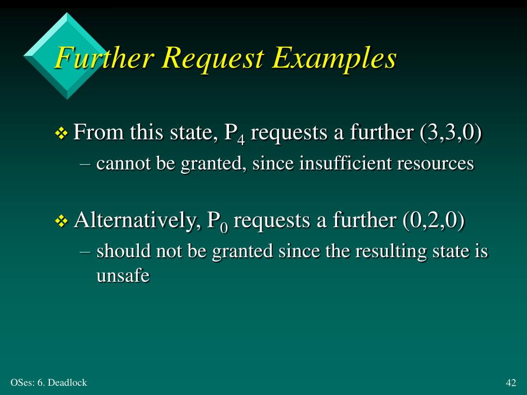 Further Request Examples • From this state, P4 requests a further (3,3,0) • cannot be granted, since insufficient resources • Alternatively, P0 requests a further (0,2,0) • should not be granted since the resulting state is unsafe