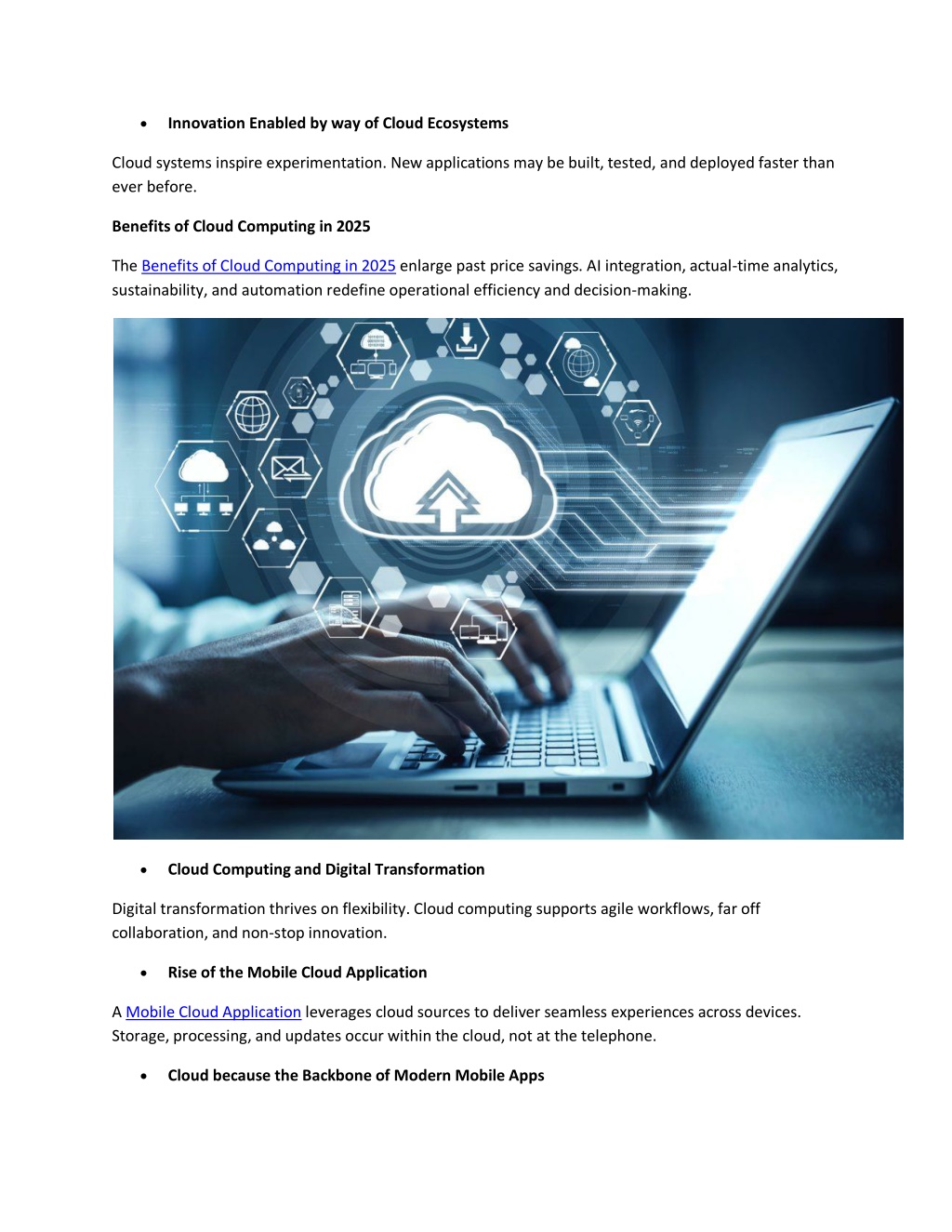Innovation Enabled by way of Cloud Ecosystems Cloud systems inspire experimentation. New applications may be built, tested, and deployed faster than ever before. Benefits of Cloud Computing in 2025 The Benefits of Cloud Computing in 2025 enlarge past price savings. AI integration, actual-time analytics, sustainability, and automation redefine operational efficiency and decision-making. Cloud Computing and Digital Transformation Digital transformation thrives on flexibility. Cloud computing supports agile workflows, far off collaboration, and non-stop innovation. Rise of the Mobile Cloud Application A Mobile Cloud Application leverages cloud sources to deliver seamless experiences across devices. Storage, processing, and updates occur within the cloud, not at the telephone. Cloud because the Backbone of Modern Mobile Apps
