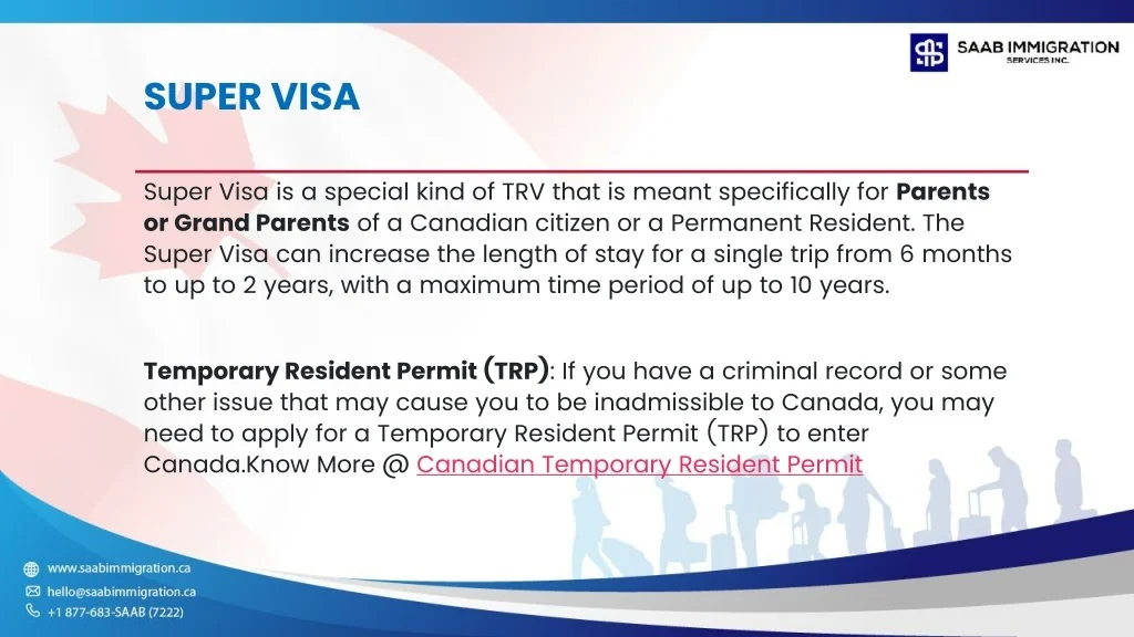 Super Visa Super Visa is a special kind of TRV that is meant specifically for Parents or Grand Parents of a Canadian citizen or a Permanent Resident. The Super Visa can increase the length of stay for a single trip from 6 months to up to 2 years, with a maximum time period of up to 10 years. Temporary Resident Permit (TRP): If you have a criminal record or some other issue that may cause you to be inadmissible to Canada, you may need to apply for a Temporary Resident Permit (TRP) to enter Canada.Know More @ Canadian Temporary Resident Permit
