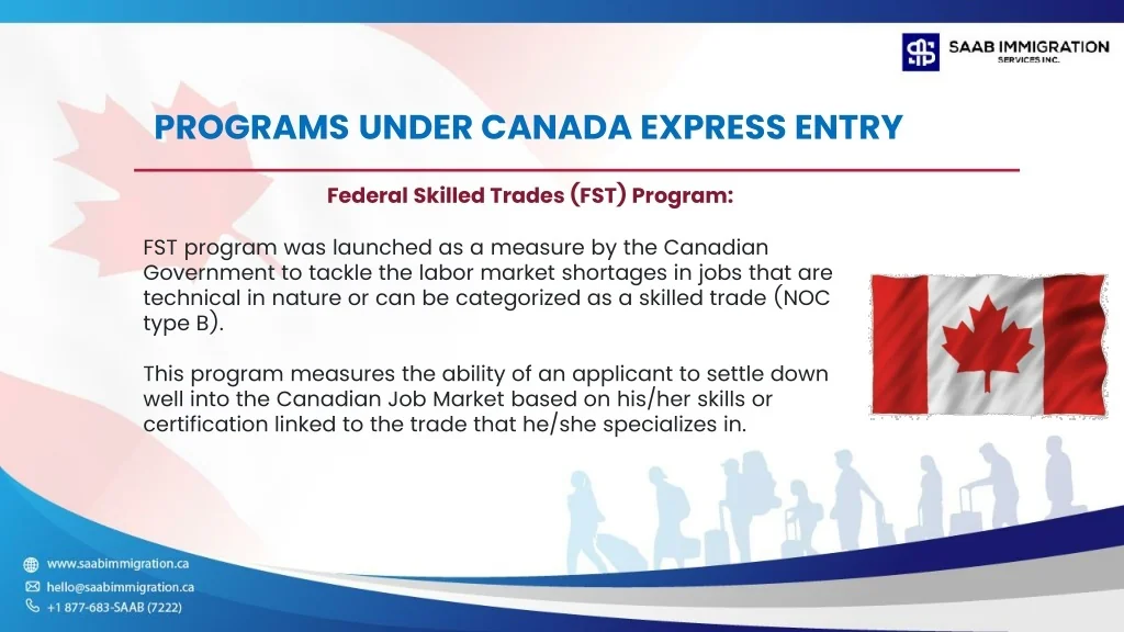 Programsunder Canada express entry Federal Skilled Trades (FST) Program: FST program was launched as a measure by the Canadian Government to tackle the labor market shortages in jobs that are technical in nature or can be categorized as a skilled trade (NOC type B). This program measures the ability of an applicant to settle down well into the Canadian Job Market based on his/her skills or certification linked to the trade that he/she specializes in.