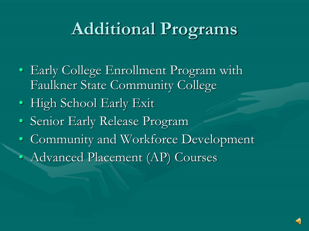 Additional Programs Early College Enrollment Program with Faulkner State Community College High School Early Exit Senior Early Release Program Community and Workforce Development Advanced Placement (AP) Courses