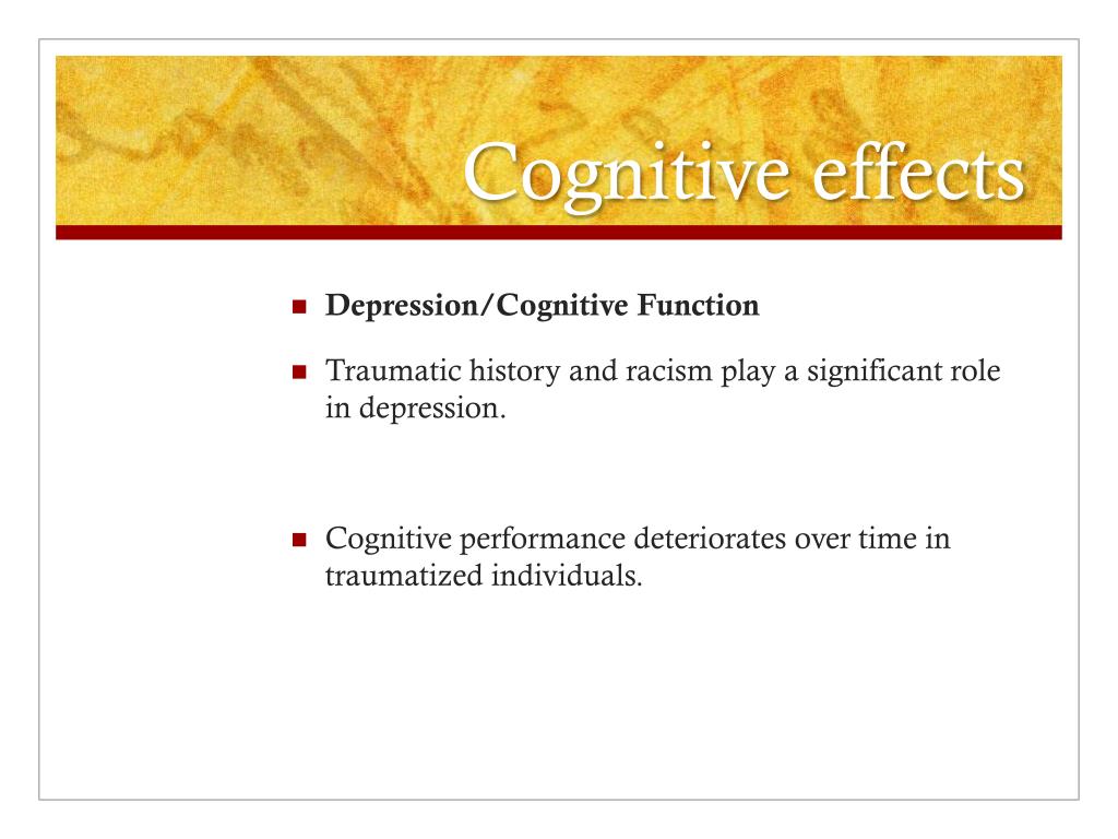 Cognitive effects • Depression/Cognitive Function • Traumatic history and racism play a significant role in depression. • Cognitive performance deteriorates over time in traumatized individuals.