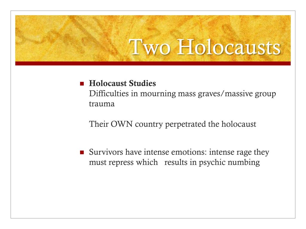 Two Holocausts • Holocaust StudiesDifficulties in mourning mass graves/massive group traumaTheir OWN country perpetrated the holocaust • Survivors have intense emotions: intense rage they must repress which results in psychic numbing
