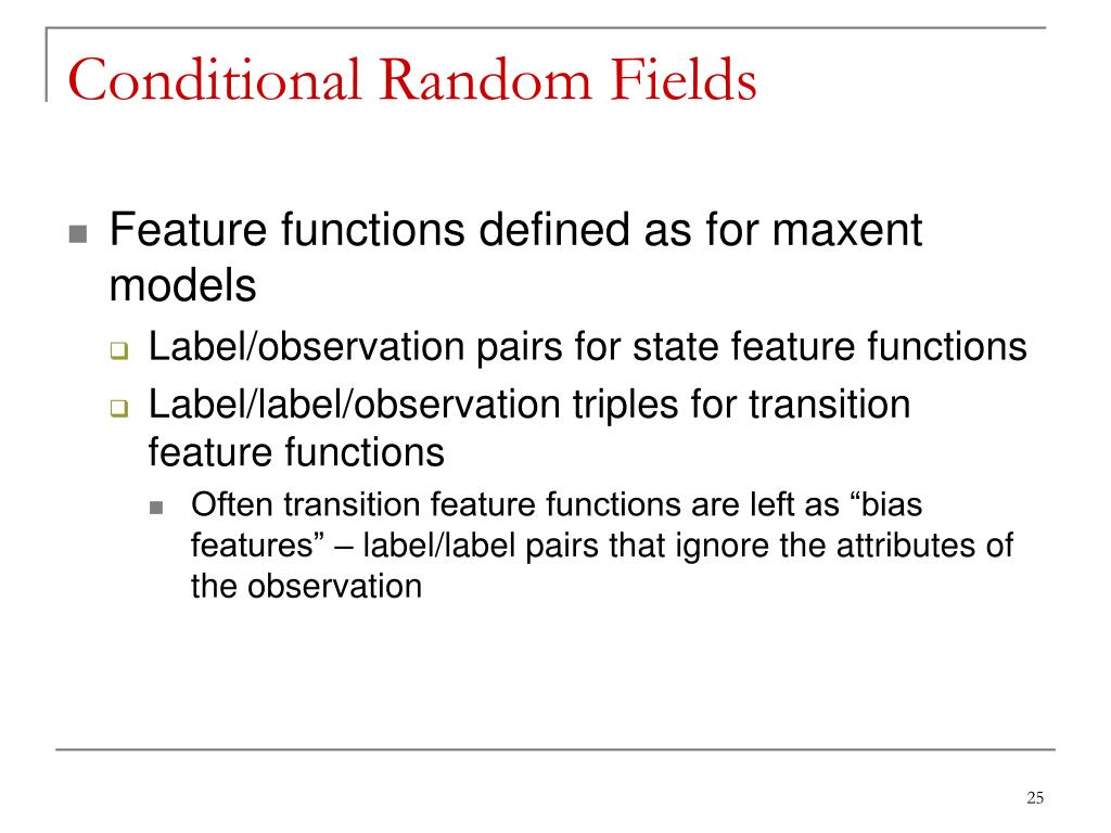 Conditional Random Fields • Feature functions defined as for maxent models • Label/observation pairs for state feature functions • Label/label/observation triples for transition feature functions • Often transition feature functions are left as “bias features” – label/label pairs that ignore the attributes of the observation