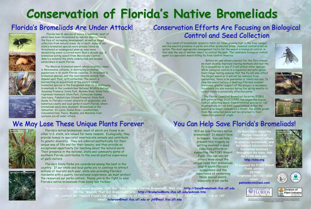 Conservation of Florida’s Native Bromeliads Florida’s Bromeliads Are Under Attack! Conservation Efforts Are Focusing on Biological Control and Seed Collection Florida has 16 species of native bromeliads, most of which have been threatened by habitat destruction in the face of increasing development, as well as illegal collection from natural areas. As a result, many of our state’s bromeliad species were already listed as threatened or endangered when an even more devastating event occurred more than a decade ago. A bromeliad-eating weevil from Mexico and Central America entered the state undetected and became established in south Florida. The Mexican bromeliad weevil, whose scientific name is Metamasius callizona, is destroying bromeliad populations in 16 south Florida counties. It threatens 11 bromeliad species, and the invertebrate animals that depend upon them, with extinction. The weevil is encroaching on populations of the state’s rarest bromeliad species in the Everglades area. It is destroying bromeliads in the Loxahatchee National Wildlife Refuge, Savannas Preserve State Park, Myakka River State Park, Highlands Hammock State Park, Corkscrew Swamp Sanctuary, Fakahatchee Strand Preserve State Park (home to Florida’s richest diversity of epiphytes), and numerous county and local parks in south Florida, where bromeliads were once abundant. Bromeliads in the Sebastian, St. Lucie, Indian River, Loxahatchee, Caloosahatchee, Peace, Myakka, and Manatee river systems are all under attack. Mexican bromeliad weevil adult As a result of bromeliads’ epiphytic habit (at times growing high in the tree canopy) and the weevil’s presence in parks and other protected areas, chemical control is not an option. The most appropriate management tactic for the weevil is biological control, in this case the use of another insect to control the pest. The candidate biological control agent is a specialist weevil-killing fly from Central America. Lixophaga sp., potential biological control agent for Mexican bromeliad weevil. Mexican bromeliad weevil larva Before we may obtain a permit for the fly’s release, we must develop improved rearing methods and test the fly in quarantine to see if it will attack other species. While biological control is a regulated and safe option (host range testing ensures that the fly will only affect the target weevil or it will not be released from quarantine), there is no guarantee of timely success. To stop the weevil before it destroys Florida’s airplant treasures, greater support of the project is necessary. Volunteers are also needed during the spring months to collect seeds in potentially affected parks. The Florida Council of Bromeliad Societies (FCBS), with permits from DOACS/DPI, has begun the crucial task of collecting seeds from bromeliad species at risk or potentially at risk from weevil attack. After the weevil is no longer considered a threat, the plants grown from the collected seeds will be returned to their respective places of origin. Larva with damage to bromeliad stem Tillandsia utriculata seeds. Weevil sightings in Florida Tillandsia seedlings. We May Lose These Unique Plants Forever You Can Help Save Florida’s Bromeliads! Florida’s native bromeliads, most of which are found in no other U.S. state, are valued for many reasons. Ecologically, they provide homes to specialist invertebrate animals and contribute to genetic diversity. They are admired aesthetically for their unique way of life and for their beauty, and they provide an exceptional opportunity for teaching about the natural world. Their presence in the national, state and community parks of southern Florida contributes to the overall positive experience of park visitors. Florida’s State Parks are considered among the best in the country. If our state and local parks are to continue to attract millions of tourists each year, while also providing Florida’s residents with a quality recreational experience, we must protect the resources our parks contain. Please join in the fight to save Florida’s native bromeliads from being lost forever. Will we lose Florida’s native bromeliads? It doesn’t have to happen. You can help prevent this tragedy by getting involved in seed collection efforts or supporting the FCBS Weevil Fund. You can also let others know about the unique roles that bromeliads play in south Florida’s ecosystems and the importance of conserving these special plants, especially in our parks. Tillandsia fasciculata (cardinal airplant) To learn more about the Florida Council of Bromeliad Societies’ efforts to save our bromeliads, and for contact information for bromeliad societies throughout the state, visit the FCBS Web site: http://fcbs.org To support the FCBS Weevil Fund, contact Ed Hall: Telephone: (407) 647-2039 email: palmetbrom@aol.com Guzmania monostachia (West Indian tufted airplant) Tillandsia utriculata (giant airplant) To learn more about the weevil problem, visit the “Save Florida’s Native Bromeliads” Web site: http://SaveBromeliads.ifas.ufl.edu Or the “Weevils That Eat Bromeliads” site: http://BromeliadBiota.ifas.ufl.edu/wvbrom.htm Or, contact Dr. Howard Frank’s lab at the University of Florida: Telephone: (352) 392-1901 ext. 122, 128 or 187 email: bclarson@mail.ifas.ufl.edu or jhf@mail.ifas.ufl.edu Although this poster was funded in part by the U.S. Environmental Protection Agency under the National Environmental Education Act grants program, it may not necessarily reflect the views of the Agency and no official endorsement should be inferred.