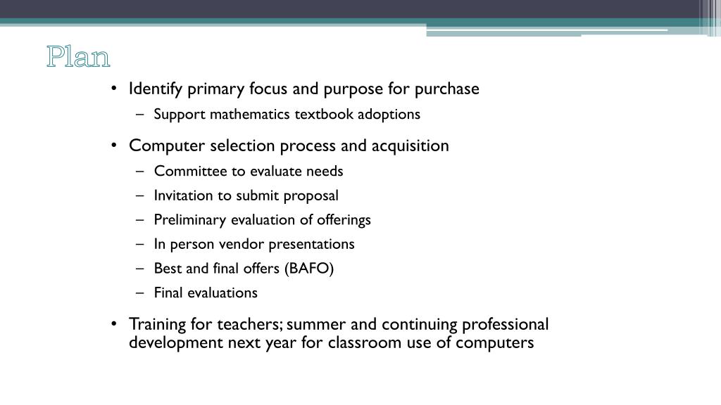 Identify primary focus and purpose for purchase • Support mathematics textbook adoptions • Computerselection process and acquisition • Committee to evaluate needs • Invitation to submit proposal • Preliminary evaluation of offerings • In person vendor presentations • Best and final offers (BAFO) • Final evaluations • Training for teachers; summer and continuing professionaldevelopmentnext year for classroom use of computers Plan