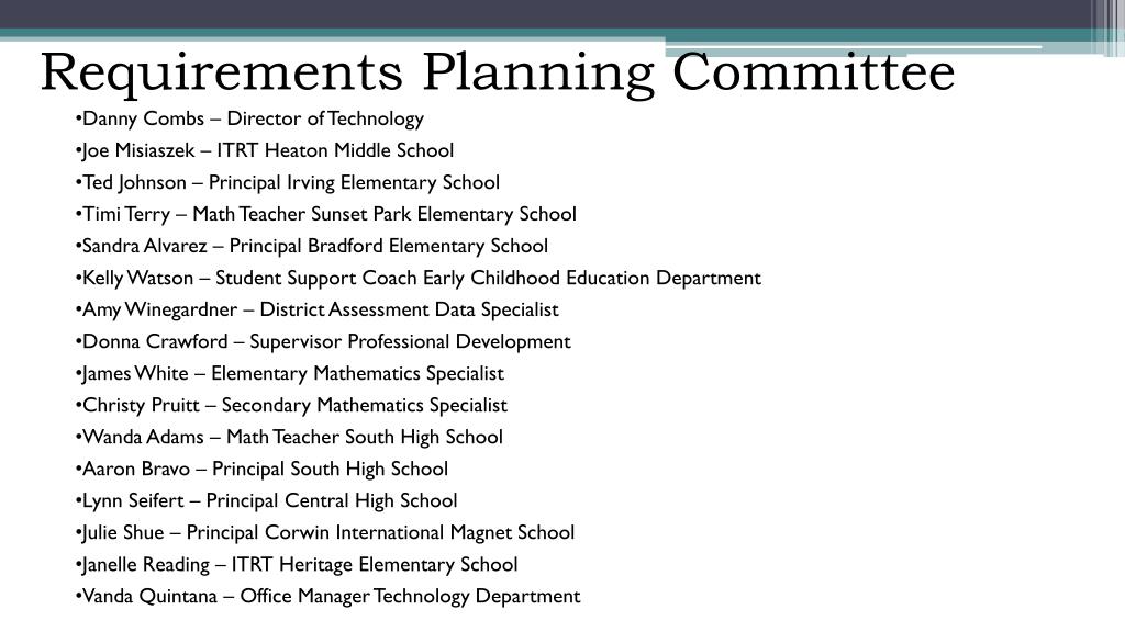 Requirements Planning Committee • Danny Combs – Director of Technology • Joe Misiaszek – ITRT Heaton Middle School • Ted Johnson – Principal Irving Elementary School • Timi Terry – Math Teacher Sunset Park Elementary School • Sandra Alvarez – Principal Bradford Elementary School • Kelly Watson – Student Support Coach Early Childhood Education Department • Amy Winegardner – District Assessment Data Specialist • Donna Crawford – Supervisor Professional Development • James White – Elementary Mathematics Specialist • ChristyPruitt – Secondary Mathematics Specialist • Wanda Adams – Math Teacher South High School • Aaron Bravo – Principal South High School • Lynn Seifert – Principal Central High School • Julie Shue – Principal Corwin International Magnet School • Janelle Reading – ITRT Heritage Elementary School • Vanda Quintana – Office Manager Technology Department