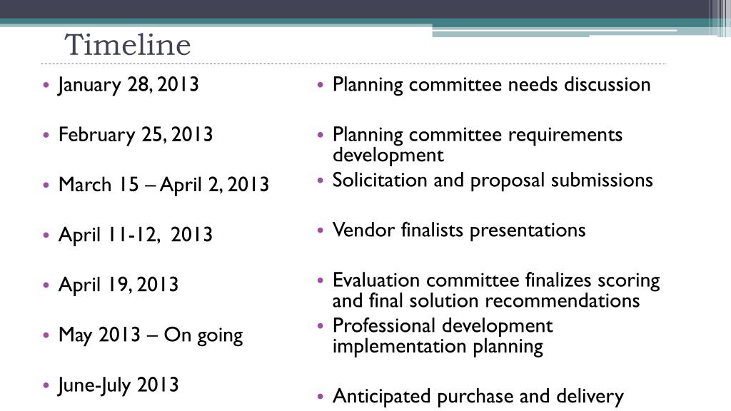 Timeline • January 28, 2013 • February 25, 2013 • March 15 – April 2, 2013 • April 11-12, 2013 • April 19, 2013 • May 2013 – On going • June-July 2013 • Planning committee needs discussion • Planning committee requirements development • Solicitation and proposal submissions • Vendor finalists presentations • Evaluation committee finalizes scoring and final solution recommendations • Professional development implementation planning • Anticipated purchase and delivery