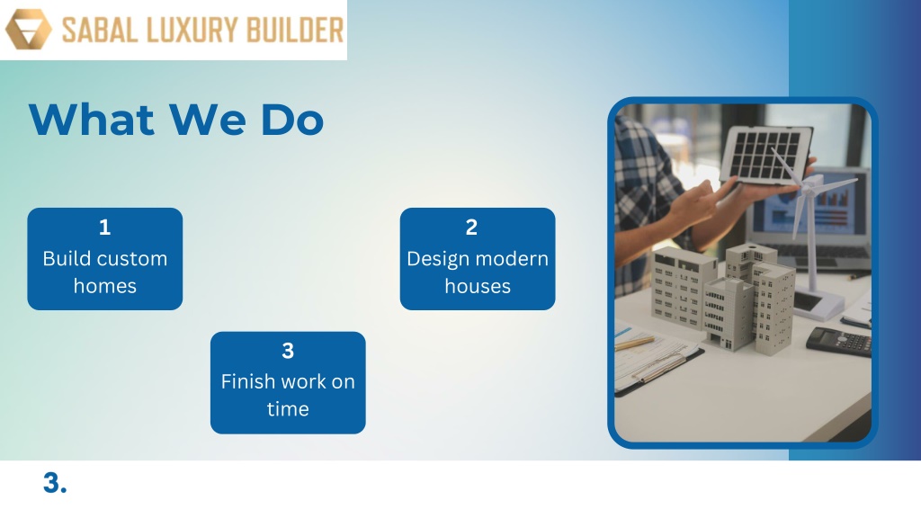 What We Do 1 2 Build custom homes Design modern houses 3 Finish work on time 3.