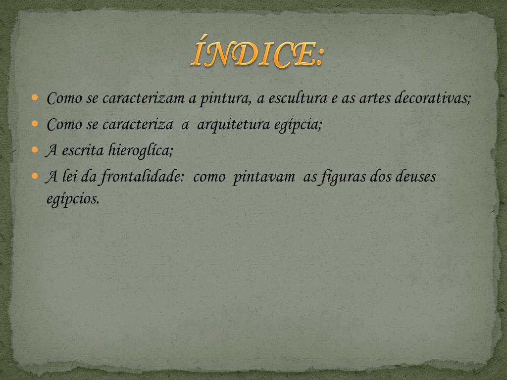 ÍNDICE: • Como se caracterizam a pintura, a escultura e as artes decorativas; • Como se caracteriza a arquitetura egípcia; • A escrita hieroglíca; • A lei da frontalidade: como pintavam as figuras dos deuses egípcios.