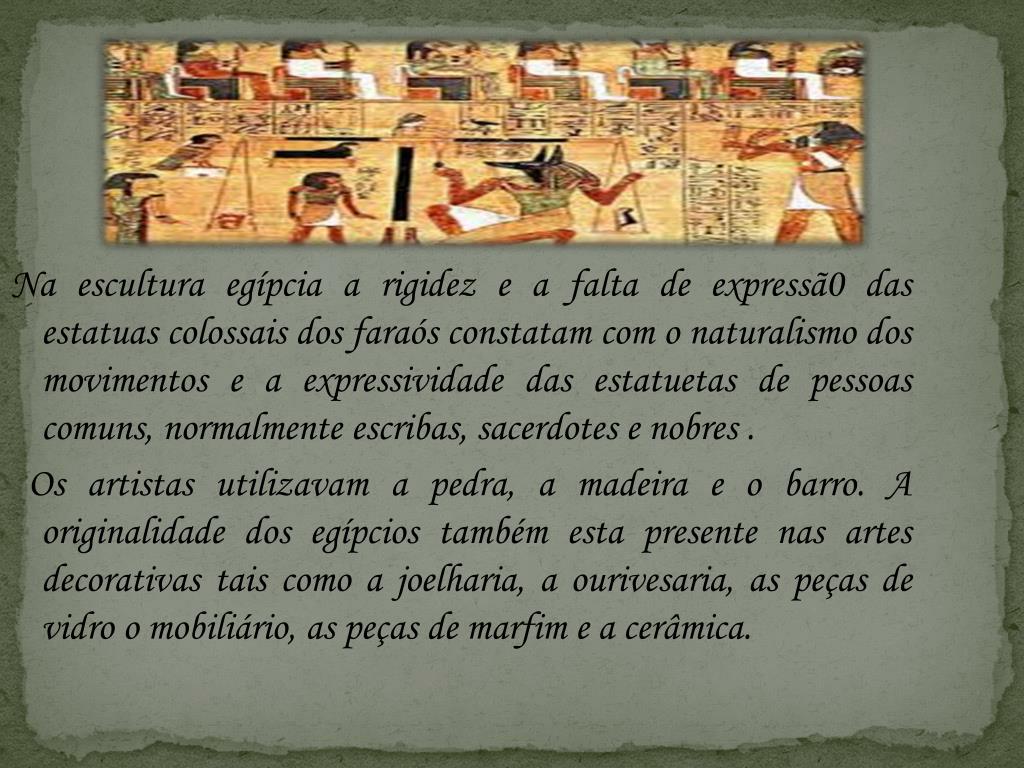 Na escultura egípcia a rigidez e a falta de expressã0 das estatuas colossais dos faraós constatam com o naturalismo dos movimentos e a expressividade das estatuetas de pessoas comuns, normalmente escribas, sacerdotes e nobres . Os artistas utilizavam a pedra, a madeira e o barro. A originalidade dos egípcios também esta presente nas artes decorativas tais como a joelharia, a ourivesaria, as peças de vidro o mobiliário, as peças de marfim e a cerâmica.
