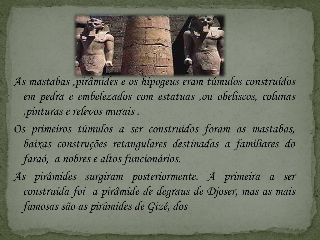 As mastabas ,pirâmides e os hipogeus eram túmulos construídos em pedra e embelezados com estatuas ,ou obeliscos, colunas ,pinturas e relevos murais . Os primeiros túmulos a ser construídos foram as mastabas, baixas construções retangulares destinadas a familiares do faraó, a nobres e altos funcionários. As pirâmides surgiram posteriormente. A primeira a ser construída foi a pirâmide de degraus de Djoser, mas as mais famosas são as pirâmides de Gizé, dos