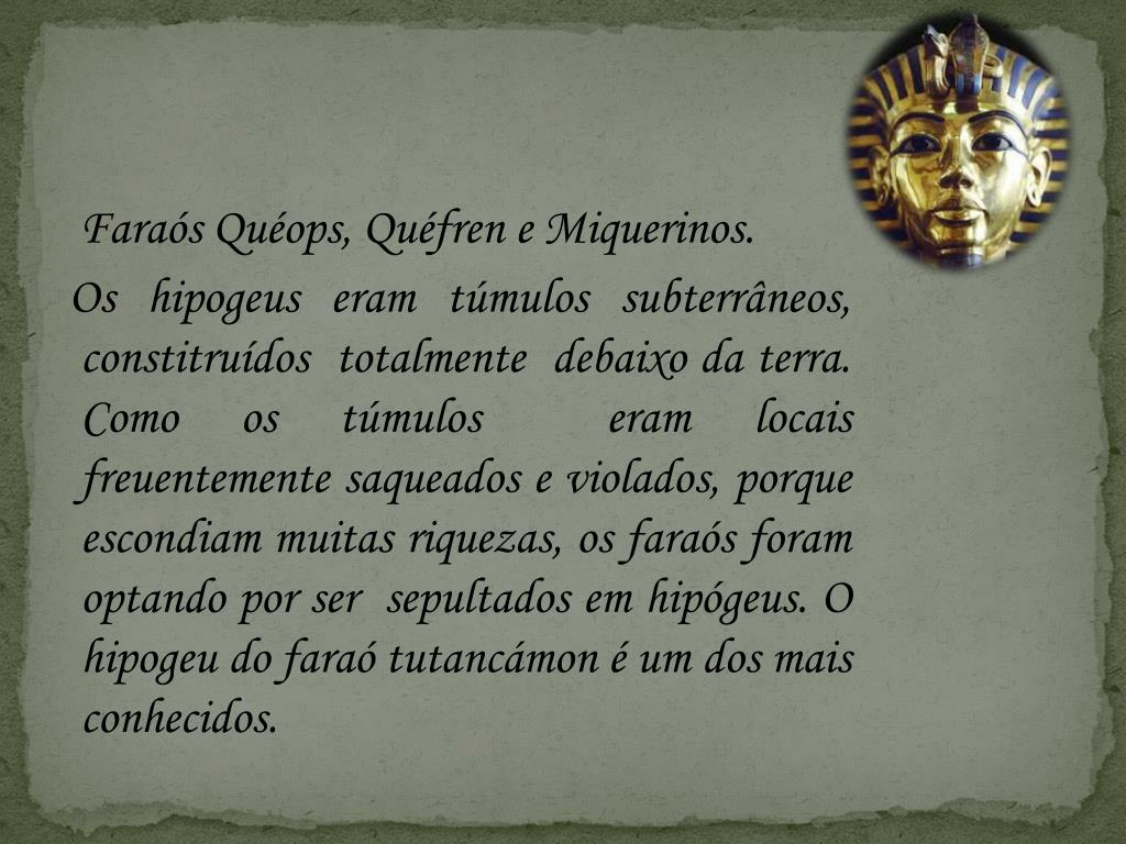 Faraós Quéops, Quéfren e Miquerinos. Os hipogeus eram túmulos subterrâneos, constitruídos totalmente debaixo da terra. Como os túmulos eram locais freuentemente saqueados e violados, porque escondiam muitas riquezas, os faraós foram optando por ser sepultados em hipógeus. O hipogeu do faraó tutancámon é um dos mais conhecidos.