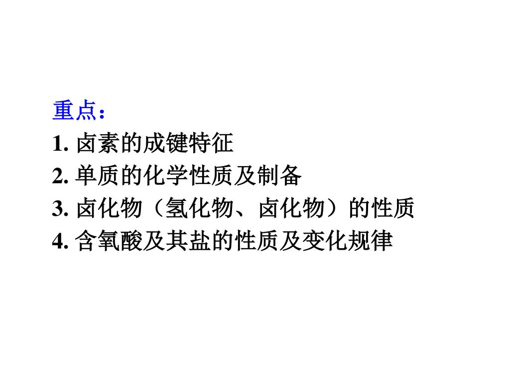 重点: 1. 卤素的成键特征 2. 单质的化学性质及制备 3. 卤化物(氢化物、卤化物)的性质 4. 含氧酸及其盐的性质及变化规律