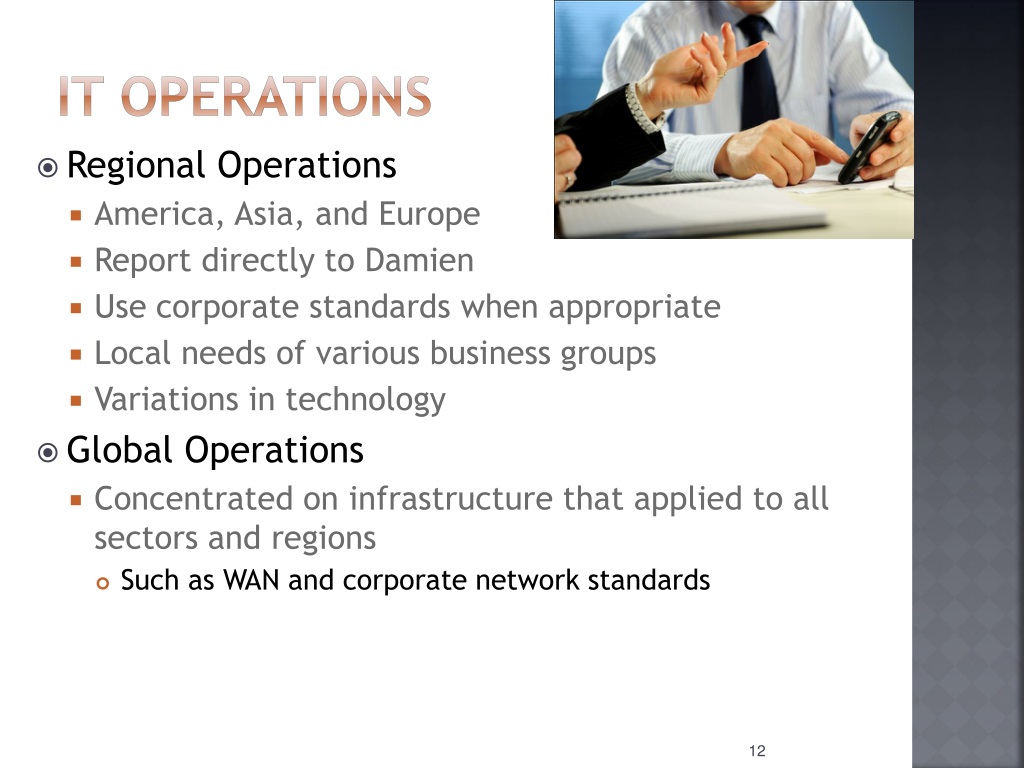 It operations • Regional Operations • America, Asia, and Europe • Report directly to Damien • Use corporate standards when appropriate • Local needs of various business groups • Variations in technology • Global Operations • Concentrated on infrastructure that applied to all sectors and regions • Such as WAN and corporate network standards