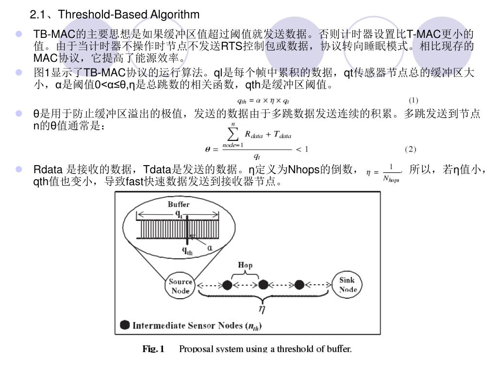 2.1、Threshold-Based Algorithm • TB-MAC的主要思想是如果缓冲区值超过阈值就发送数据。否则计时器设置比T-MAC更小的值。由于当计时器不操作时节点不发送RTS控制包或数据,协议转向睡眠模式。相比现存的MAC协议,它提高了能源效率。 • 图1显示了TB-MAC协议的运行算法。ql是每个帧中累积的数据,qt传感器节点总的缓冲区大小,α是阈值0<α≤θ,η是总跳数的相关函数,qth是缓冲区阈值。 • θ是用于防止缓冲区溢出的极值,发送的数据由于多跳数据发送连续的积累。多跳发送到节点n的θ值通常是: • Rdata 是接收的数据,Tdata是发送的数据。η定义为Nhops的倒数, 。所以,若η值小,qth值也变小,导致fast快速数据发送到接收器节点。