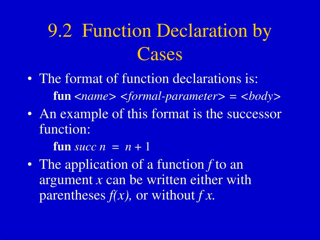 9.2 Function Declaration by Cases • The format of function declarations is: fun <name> <formal-parameter> = <body> • An example of this format is the successor function: fun succn = n + 1 • The application of a function f to an argument x can be written either with parentheses f(x), or without f x.