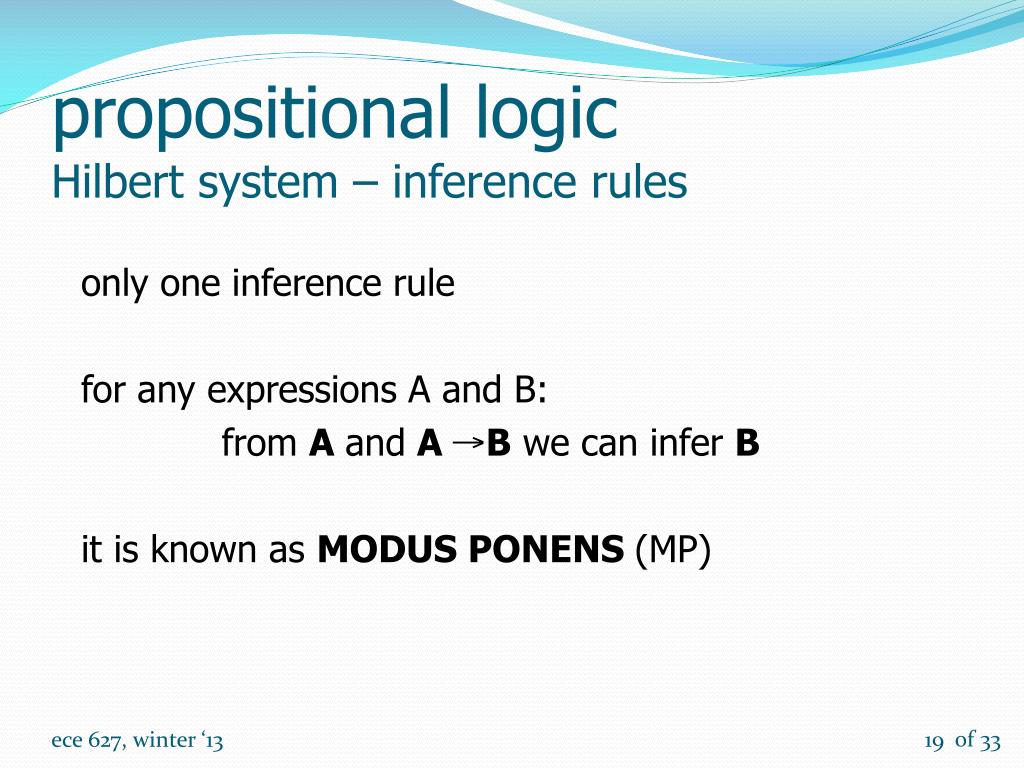 propositional logicHilbert system – inference rules only one inference rule for any expressions A and B: from A and A B we can infer B it is known as MODUS PONENS (MP)