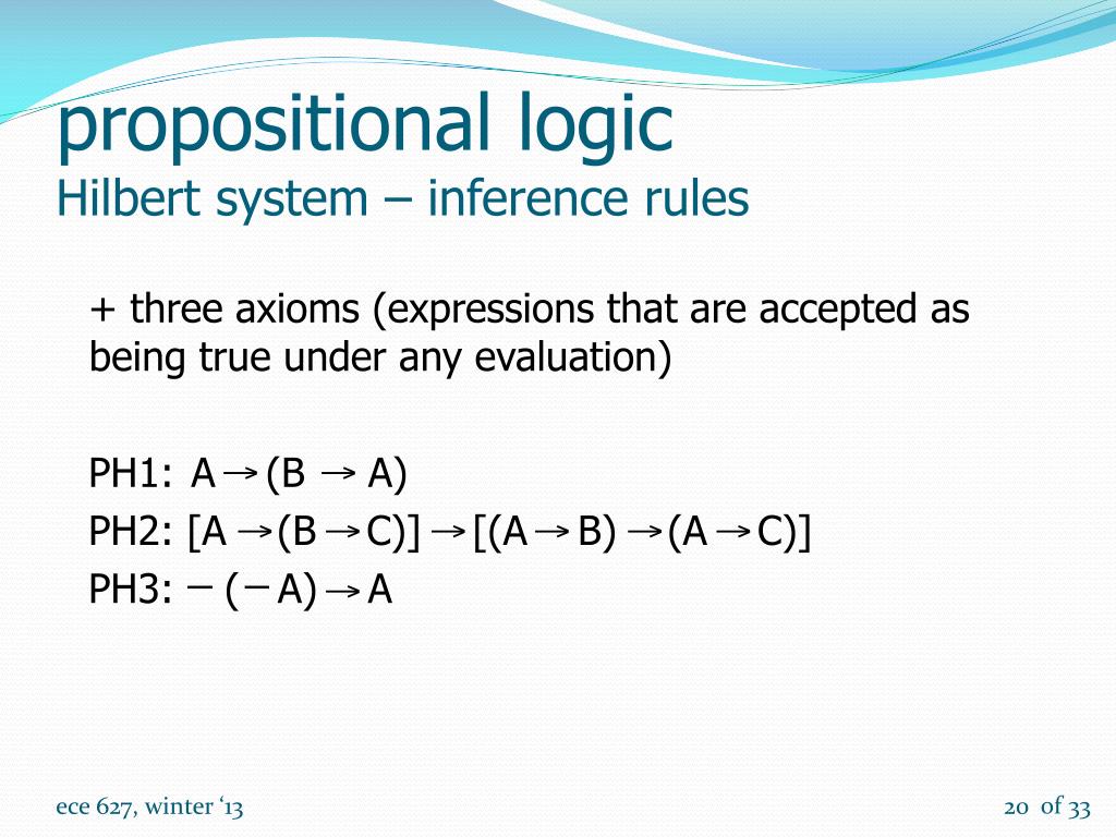 propositional logicHilbert system – inference rules + three axioms (expressions that are accepted as being true under any evaluation) PH1: A (B A) PH2: [A (B C)] [(A B) (A C)] PH3: ( A) A