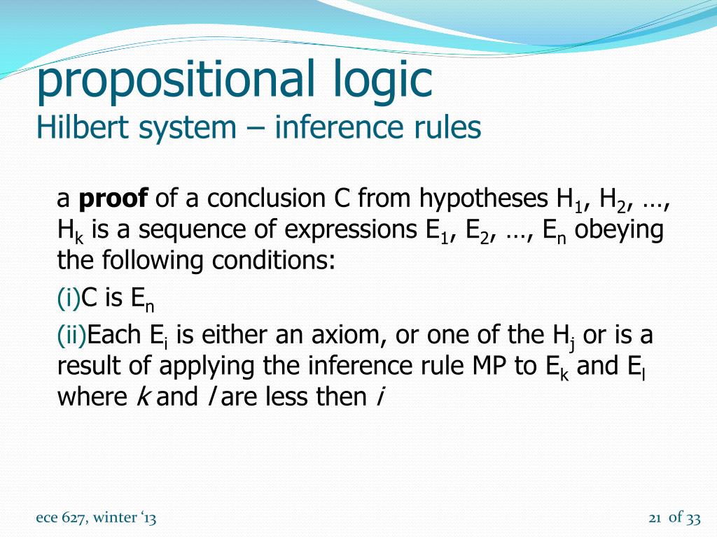 propositional logicHilbert system – inference rules a proof of a conclusion C from hypotheses H1, H2, …, Hk is a sequence of expressions E1, E2, …, En obeying the following conditions: • C is En • Each Ei is either an axiom, or one of the Hj or is a result of applying the inference rule MP to Ek and El where k and l are less then i
