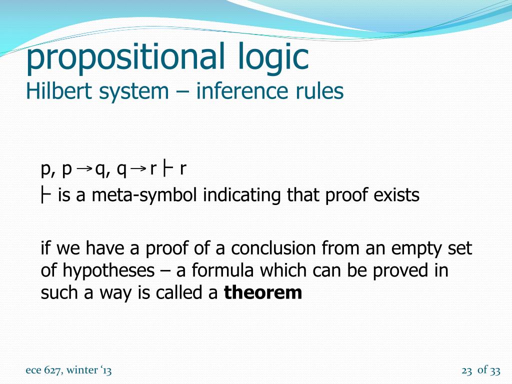 propositional logicHilbert system – inference rules p, p q, q r r is a meta-symbol indicating that proof exists if we have a proof of a conclusion from an empty set of hypotheses – a formula which can be proved in such a way is called a theorem